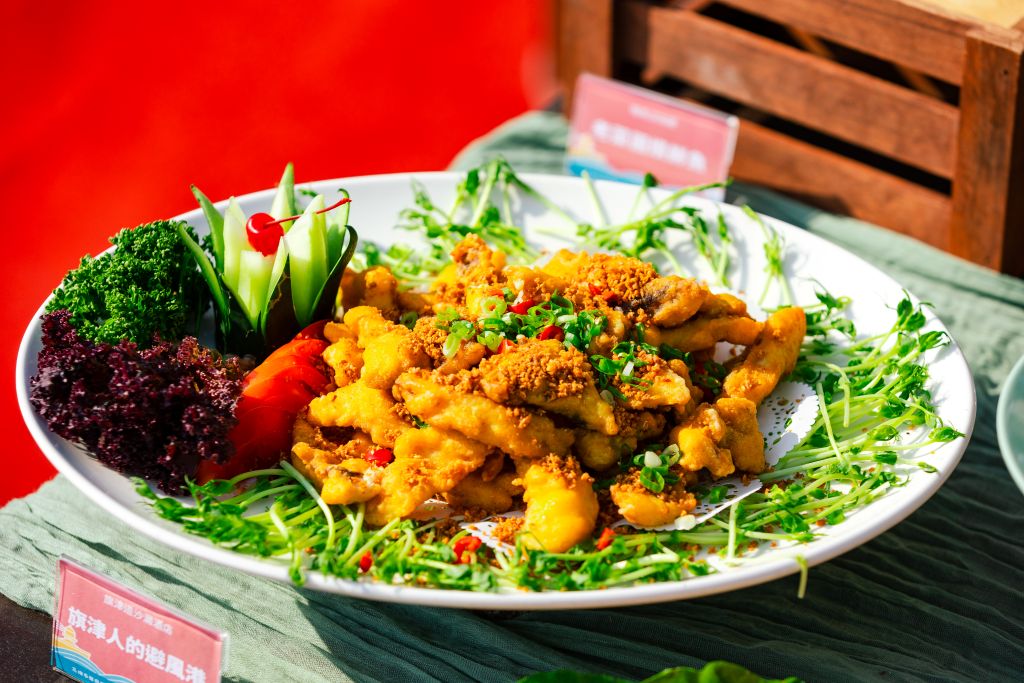 本次發表的創意料理令人驚艷,「鴨角活海產」推出「老菜脯煨鮮魚」,以陳年老菜脯與現流鮮魚煨煮,展現鑊氣與古早味;「來溫叨呷奔」的「乾煎海鱺魚」佐以柑橘味噌醬,細緻呈現食材本味。「怕燙食驗室」打造視覺搶眼的竹炭「黑沙蝦蝦生菜堡」;「大碗公冰甜品」則有30倍大的「海鹽奶茶粉粿大碗公冰」,鹹甜交織。「有間冰舖」以夕陽意象推出兩款創意冰品;老店「斗六冰城2號店」獻上濃郁的「巧克力冰淇淋蛋糕」。鹹食點心方面,「海之星沙灘俱樂部」的「旗津村浪岸卷卷」酥脆如浪花;「旗津道沙灘酒店」端出「旗津人的魚」及「避風港」兩道海味;「旗津沙灘吧」則豪邁使用軟殼蟹與烏魚子製作漢堡與薯條。「島民烘焙」選用海鹽製作「津凰餅」;「船說」則創新推出結合XO醬與堅果的「XO三鮮堅果塔」,每道料理都極具旗津風土特色。