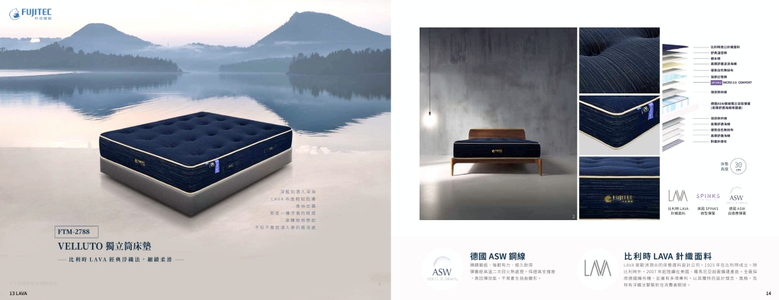 這份對睡眠品質的追求亦體現在FUJITEC科技睡眠全新上市的 VELLUTO 床墊上,結合歐洲頂級工藝設計,採用德國ASW高品質鋼線,經過高溫二次回火處理,具備卓越的彈性與耐用度,即使長時間使用依然能維持穩定且持久的睡眠承托;同時搭配比利時LAVA針織面料,以其經典浮織專利技術製成,細緻柔軟、透氣舒適,宛如絲霧般輕貼肌膚,帶來漂浮般的輕盈感受。再加上英國SPINKS全球最小口徑 MICRO 3.5 COMFORT微型彈簧,能精準貼合人體壓力點,減輕壓迫感並有效降低翻身次數,讓使用者能更快進入深層睡眠,徹底釋放一整天累積的疲憊。從材質到設計,FUJITEC科技睡眠VELLUTO 床墊以頂級工藝與精密結構,將舒眠提升至新境界,為重視睡眠品質的您帶來「無壓睡眠」的極致享受,真正打造出頂級歐式睡感床墊。